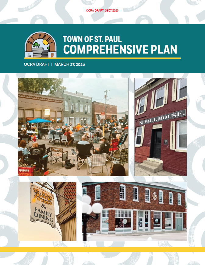 Developed through a collaborative process involving residents, business owners, and regional stakeholders, the plan outlines specific goals and actionable policies across 13 topics required by the Office of Community and Rural Affairs (OCRA). In 2025, the Town of St. Paul partnered with the Southeast Indiana Regional Planning Commission (SIRPC) to secure an OCRA planning grant. This program leverages Community Development Block Grant funding from the U.S. Department of Housing and Urban Development to empower communities to invest in their own long-term improvement and sustainability.