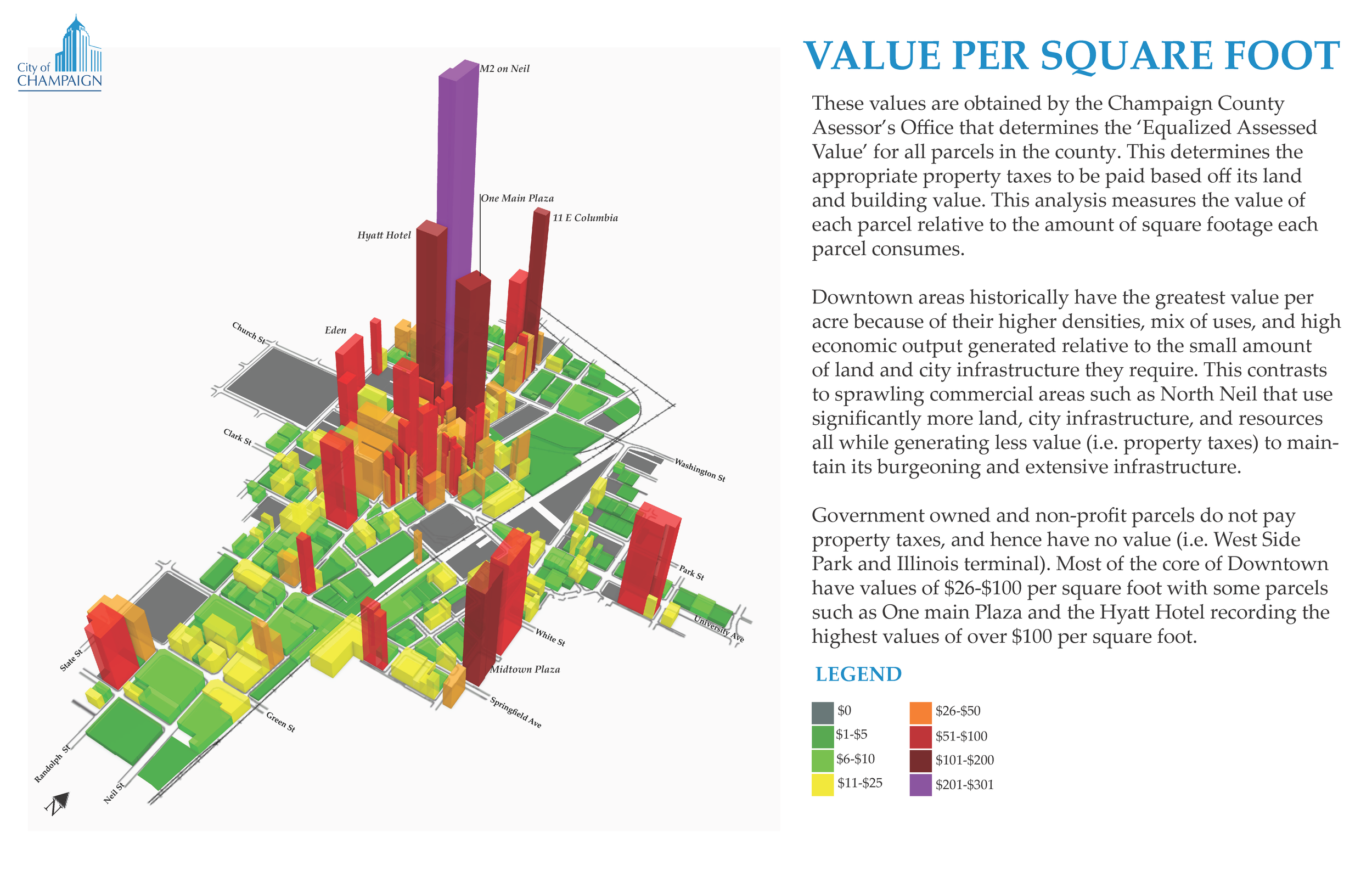 Roughly bounded by Westside Park and State Street to the west, Columbia Street to the north, First Street to the east, and Green Street to the south, Downtown and Midtown Champaign make up the historic and commercial core of the City of Champaign. It is in these spaces where the foundations of the City of Champaign first materialized. Downtown Champaign has evolved and adapted over centuries from the beginnings of a railroad town, to a bustling commercial core, and from decline during urban renewal and suburbanization. In the past two decades, public and private reinvestment has transformed Downtown Champaign into a vibrant and attractive urban center that has ushered in new residential, mixed-use, and commercial developments. The stunning transformation of Downtown Champaign from a declining center to a lively and resilient urban core has made it a model for revitalization for other downtowns across the region. This report will help shape the new Downtown Plan in which aims to provide a collective vision for an inclusive and economically prosperous Downtown for next-generation residents, patrons, and small businesses.