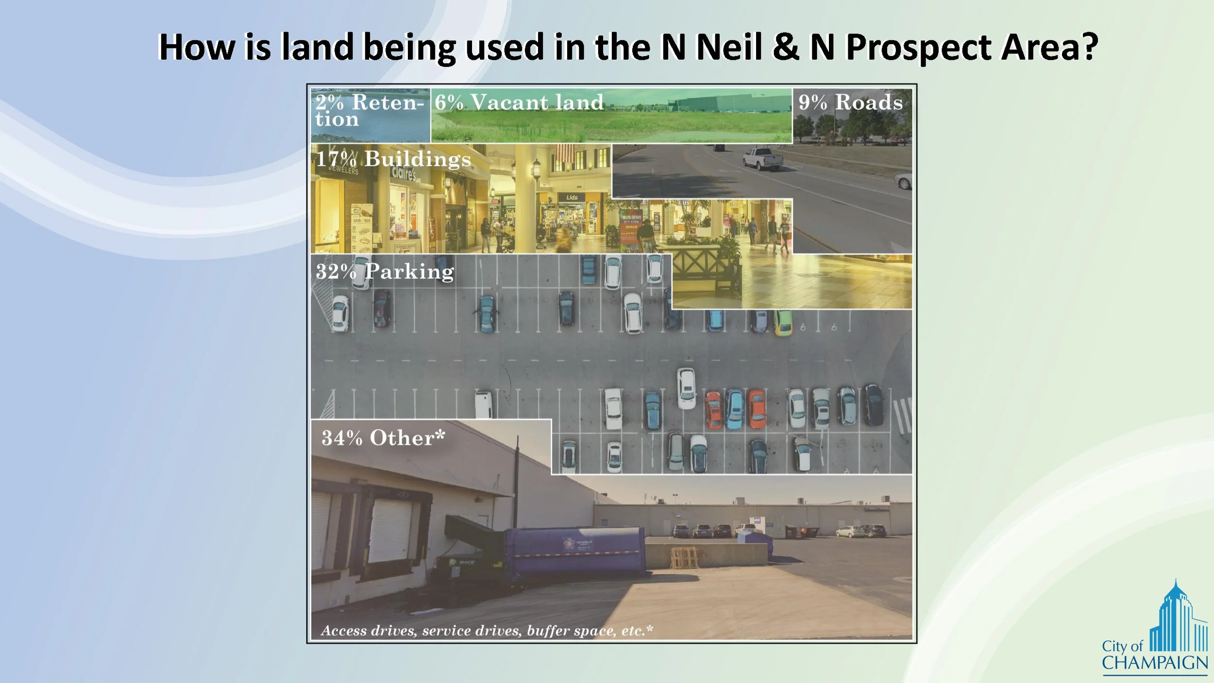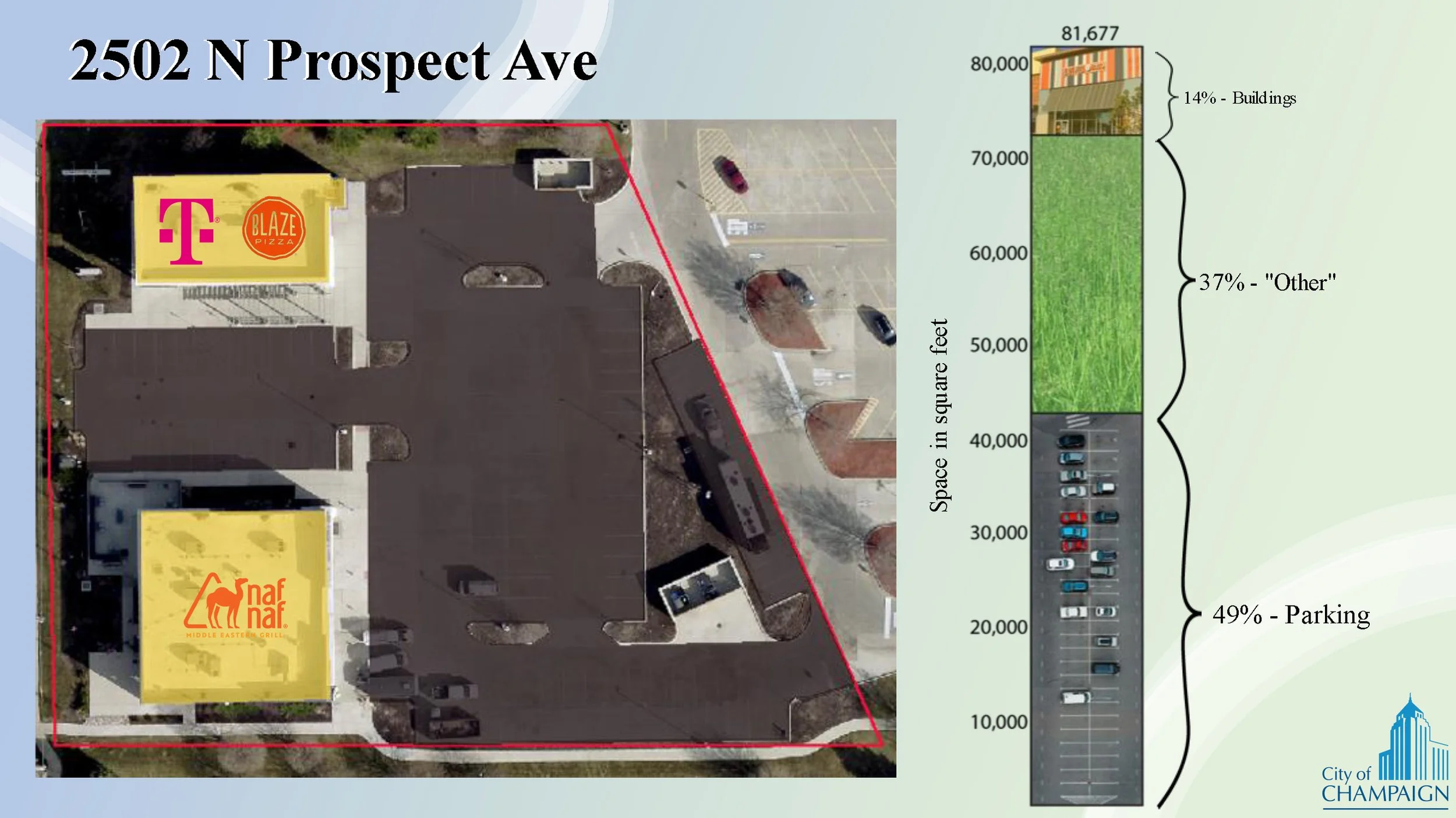 As evident through these figures, overall, the North Neil/North Prospect Area is overparked. While it is estimated that over 20,550 parking spots exist in the area, Champaign's zoning code (based of parking minimums) only require 15,939 spots. Not only does this mean that this area is 22% overparked, but the roughly 1,800,000 million square feet in excess parking could be used by actual commercial, residential, or mixed land uses that generate additional tax revenue.