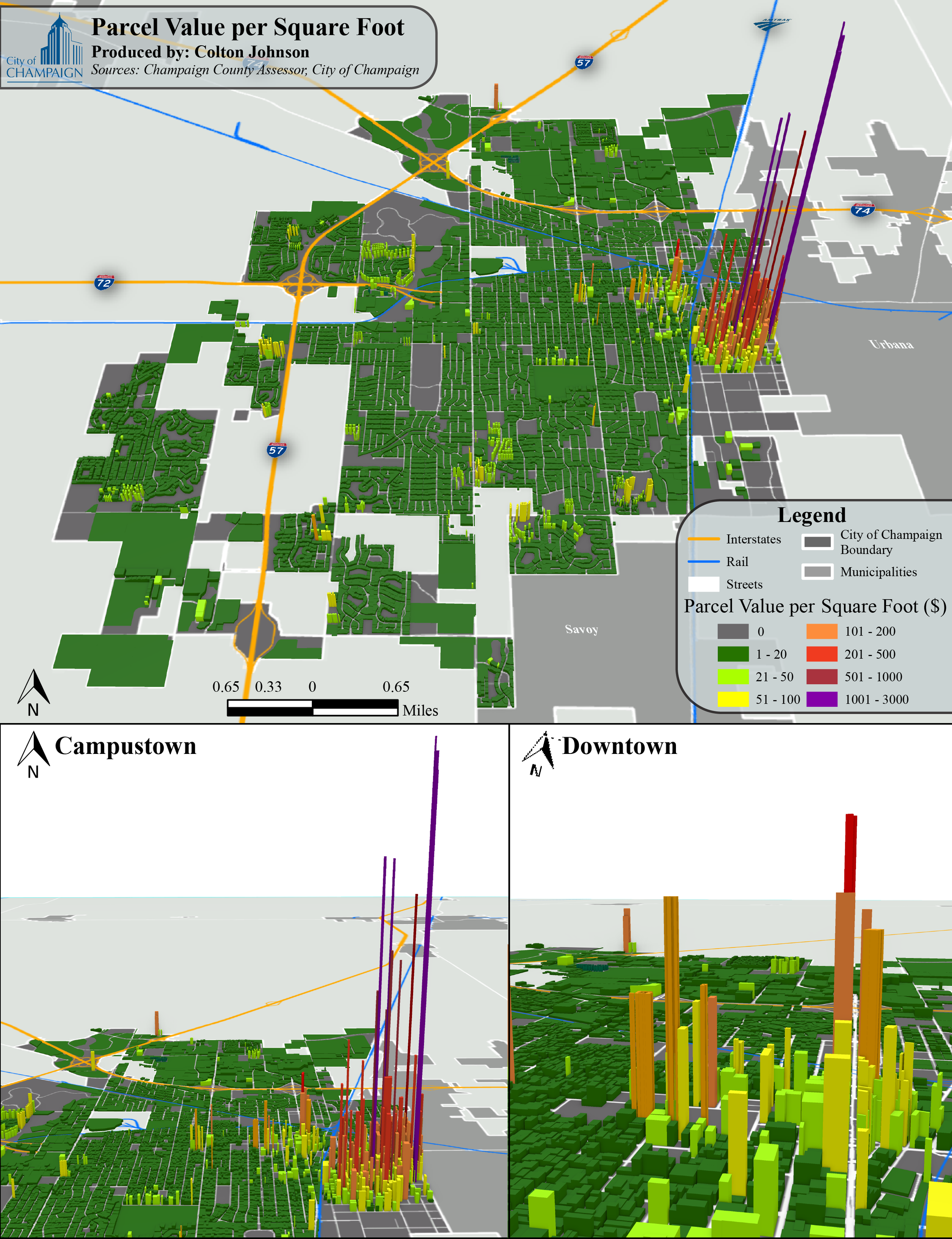 The two maps to the right reveals the striking disparities in land value efficiency across Champaign by visualizing the assessed value per square foot of every parcel. This spatial analysis highlights how certain neighborhoods generate extraordinary economic value from minimal land area—a key metric of urban productivity.