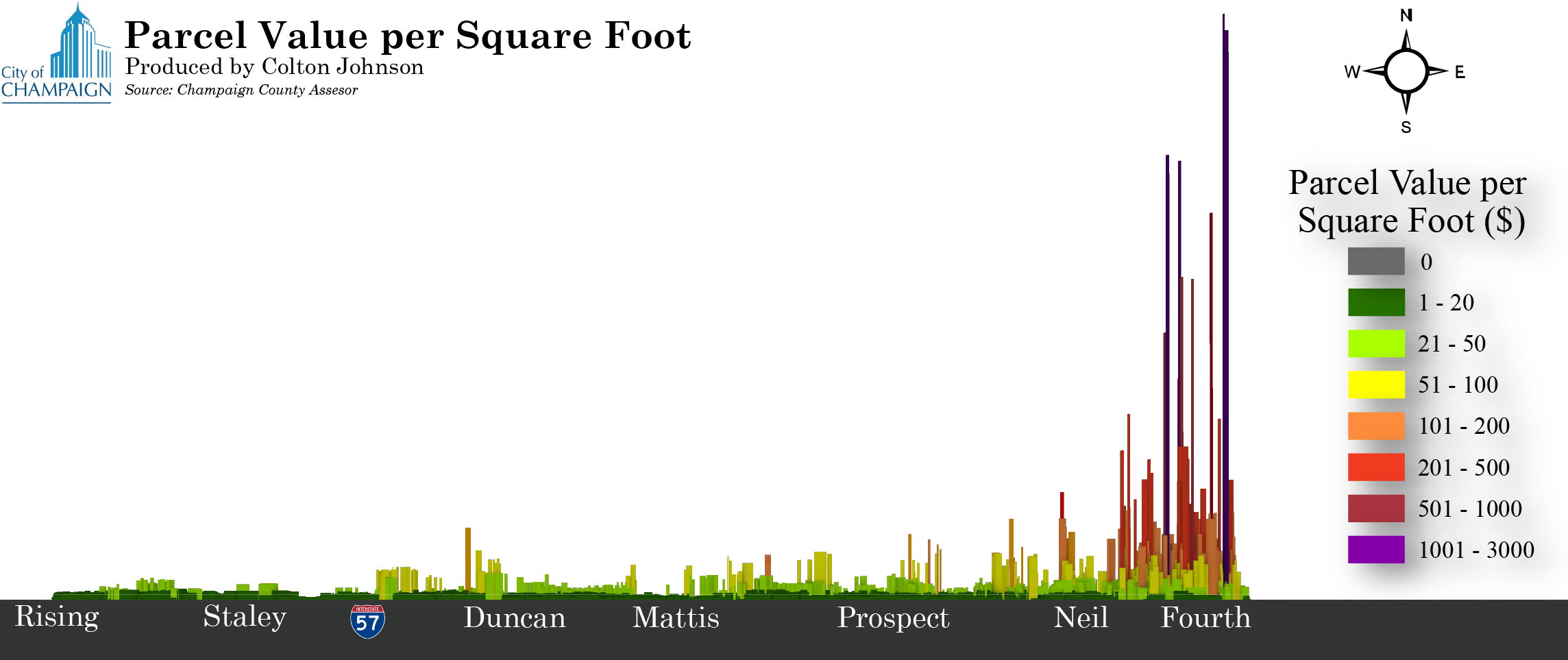 As a Strong Towns member and data visualization geek, I have long been attracted to Urban3’s stunning visualizations, illustrating the value of land within cities in a fascinating, understandable, and visually appealing 3D depiction. As a result, for my graduate capstone project, I conducted a Return-on-Investment Analysis on the City of Champaign, home to the University of Illinois. While my capstone cannot be as detailed or in depth as other analyses by Urban3, I expected similar results.